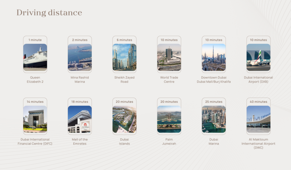 Strategically located near Dubai’s key ports and transport networks, Dubai Maritime City provides excellent connectivity to international trade routes.